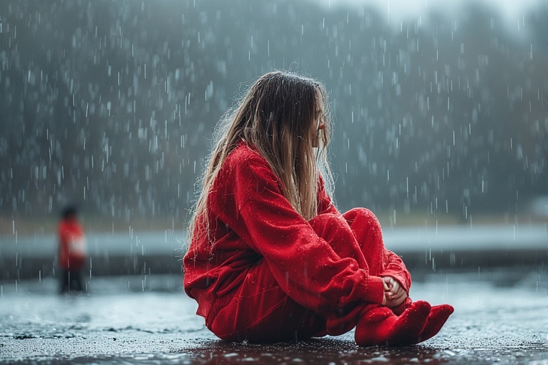 The video begins with a calm, rainy scene outdoors. The ground glistens with leftover raindrops, and the stone pavement mirrors the soft light of the cloudy sky. Into this muted setting walks a woman dressed in a vivid red tracksuit — bright, relaxed, and instantly eye‑catching against the subdued backdrop. 🌧️🔴